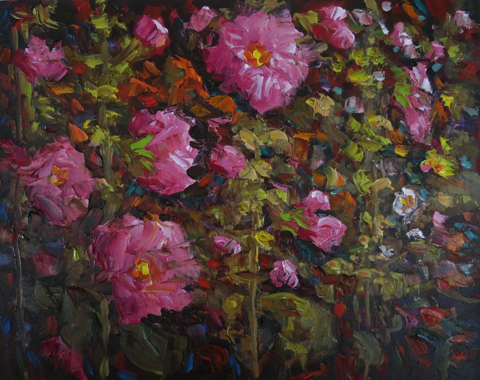 colorful hollyhock garden