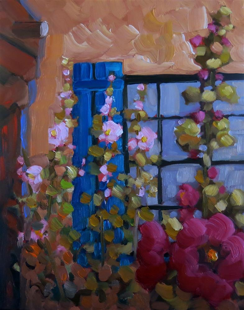 Corrales hollyhocks under an adobe portal in Corrales