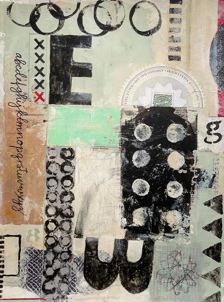 Several of my past disciplines have emerged in this painting: calligraphy, stencilling, quilting. I enjoyed making it.
