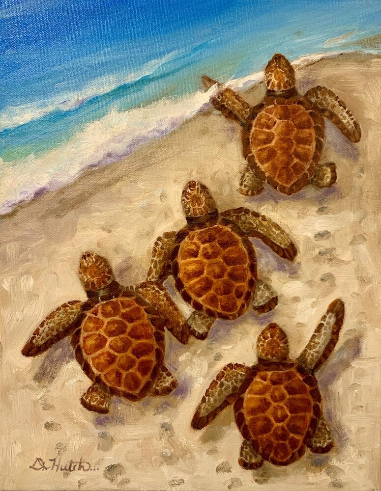 Many years ago, I was walking my dalmatian on the beach in So. Florida when the sand started to bubble up. We went over to check it out. A nest of small loggerhead turtles had hatched, and the little ones were digging their way out and scurrying to the water. My dog and I watched and protected them until they all had made it to the ocean. It was such an inspiring sight that I immediately went to the studio and produced an artwork with an image of these little turtles. It has become one of my favorite memories and subjects. This is a gallery wrapped canvas with the sides painted. Ready to hang. Many years ago, I was walking my dalmatian on the beach in So. Florida when the sand started to bubble up. We went over to check it out. A nest of small loggerhead turtles had hatched, and the little ones were digging their way out and scurrying to the water. My dog and I watched and protected them until they all had made it to the ocean. It was such an inspiring sight that I immediately went to the studio and produced an artwork with an image of these little turtles. It has become one of my favorite memories and subjects. This is a gallery wrapped canvas with the sides painted. Ready to hang. |