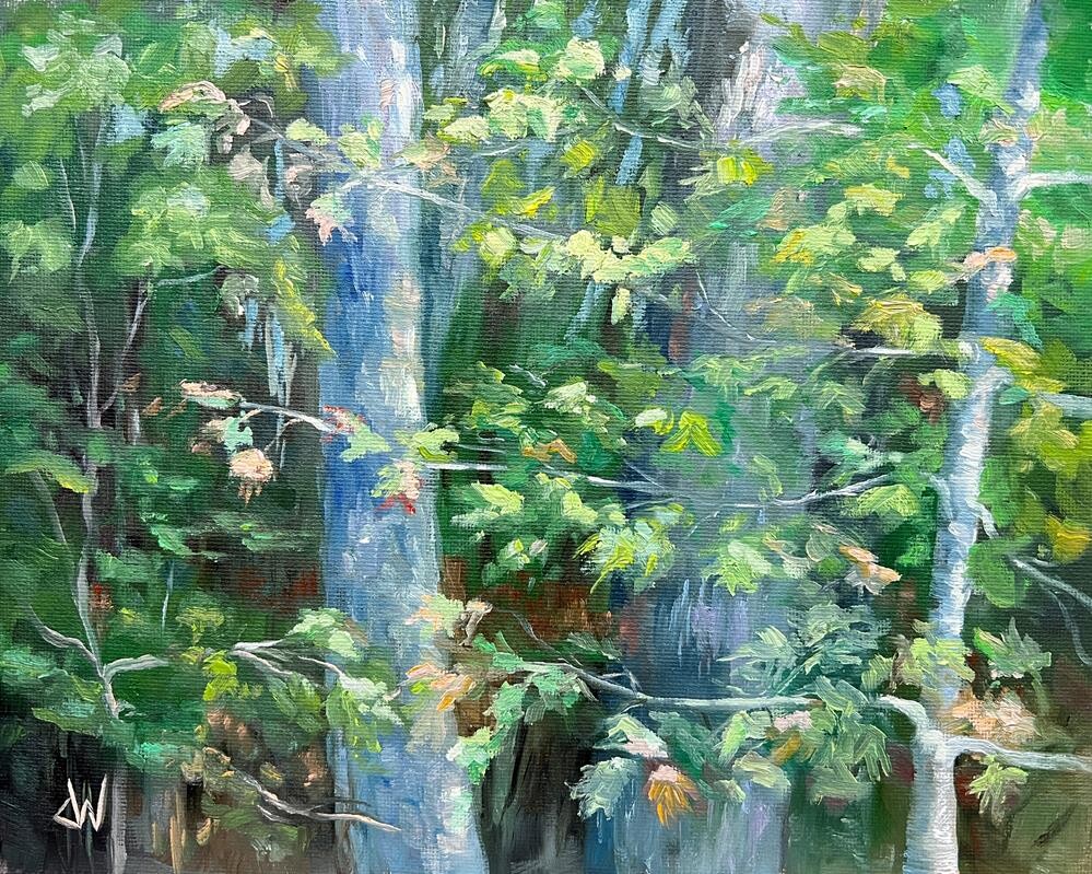 The reference for this painting is the view out my kitchen window. The breeze was making the leaves dance. The reference for this painting is the view out my kitchen window. The breeze was making the leaves dance. |