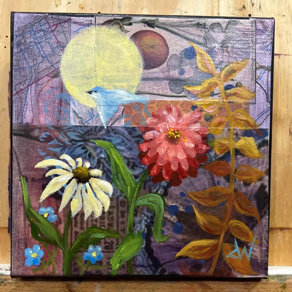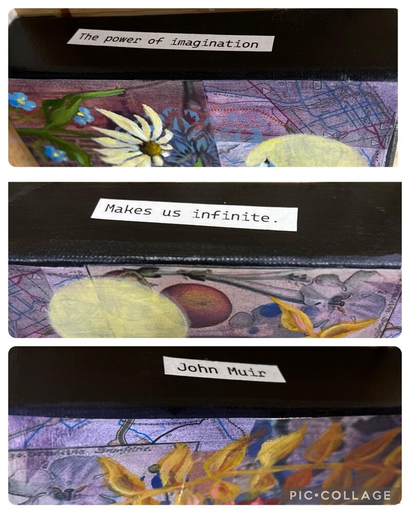 This mixed media work is on gallery wrapped canvas and has along the edges the quote “The power of imagination Makes us infinite.” John Muir This mixed media work is on gallery wrapped canvas and has along the edges the quote “The power of imagination Makes us infinite.” John Muir |