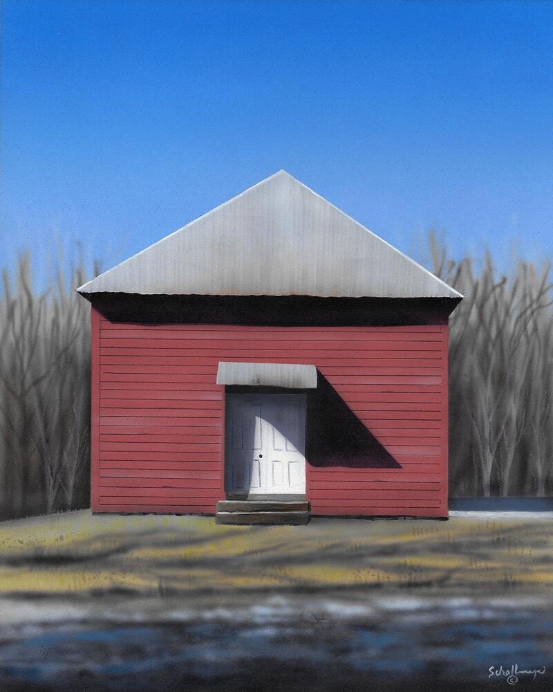 I drive by this old one room schoolhouse almost every day. The owners have done some limited renovation over the years. I always thought about doing a painting of the scene so on Sunday as I drove by, I noticed the diagonal shadow being cast from the entry door roof. I then photographed the place and used those photos as reference to produce this painting. I like the diagonal shadow contrasting with the verticals and horizontals of the building.