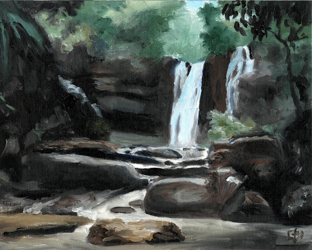 Kauai gets a lot of rain and much of it falls on the interior and then flows to the sea via waterfalls and streams. Only the most hardy venture into the forest. I have been working on a series of paintings about Hawaii, mostly Kauai on 8 x 10 inch boards. Hawaii, because it is one of the most beautiful and interesting places I have seen. On three trips, we fell in love with the place and hope to go back some day. 8 x 10 inch boards because I find that framing is often very expensive. Using a standard size like this reduces the cost. Often framing gets assigned a greater value than the painting itself. I try not to take offense from that.
