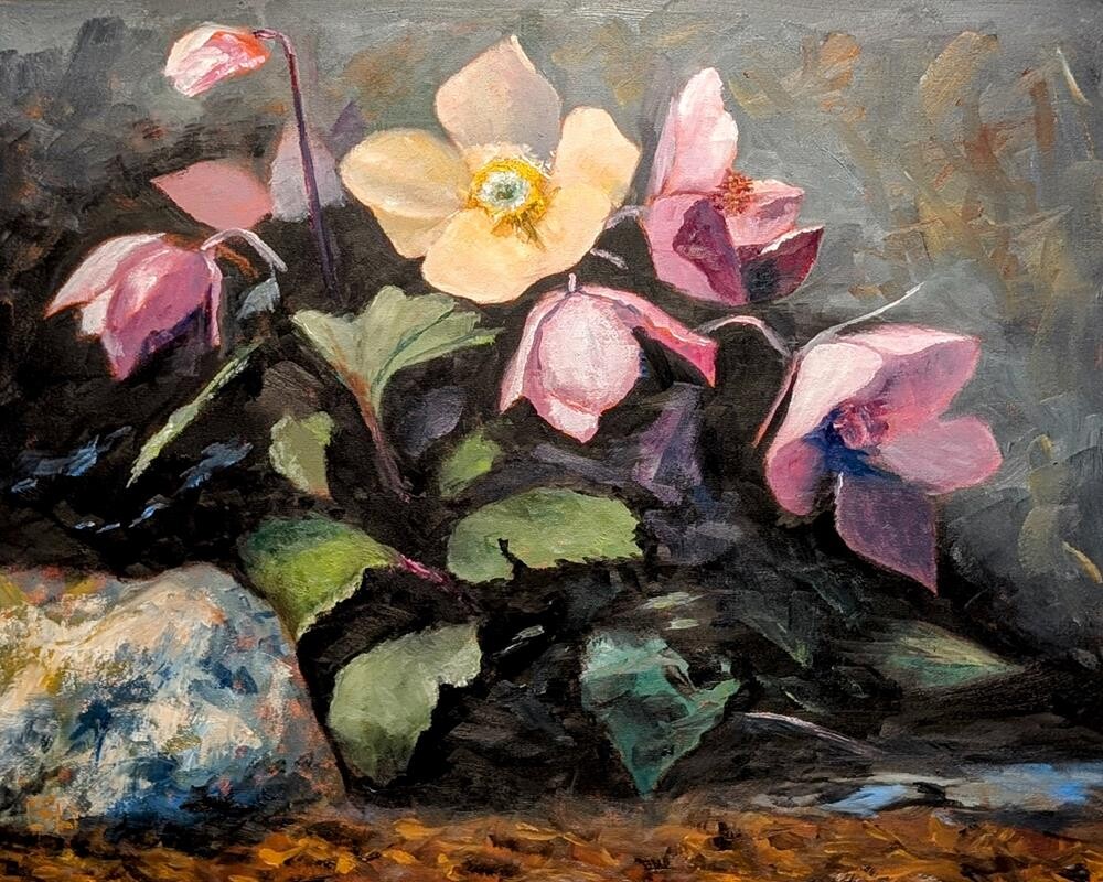 This is sometimes called a Christmas rose because that is when it blooms in warmer places than where we are. The leaves stick around through most of the year though.