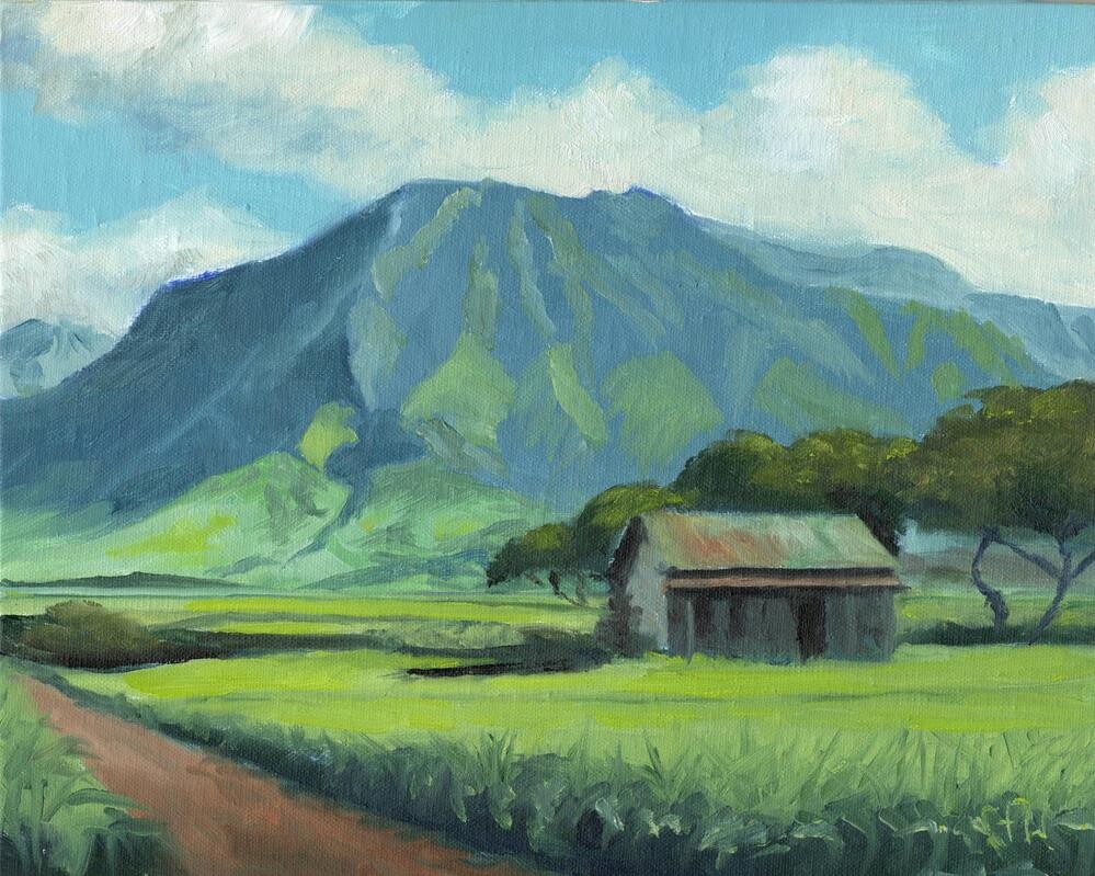I have been working on a series of paintings about Hawaii, mostly Kauai on 8 x 10 inch boards. Hawaii, because it is one of the most beautiful and interesting places I have seen. On three trips, we fell in love with the place and hope to go back some day. 8 x 10 inch boards because I find that framing is often very expensive. Using a standard size like this reduces the cost. Often framing gets assigned a greater value than the painting itself. I try not to take offense from that.