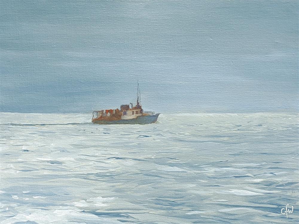 oil on mounted linen. Here comes the fishing boat from picking up traps in early morning.