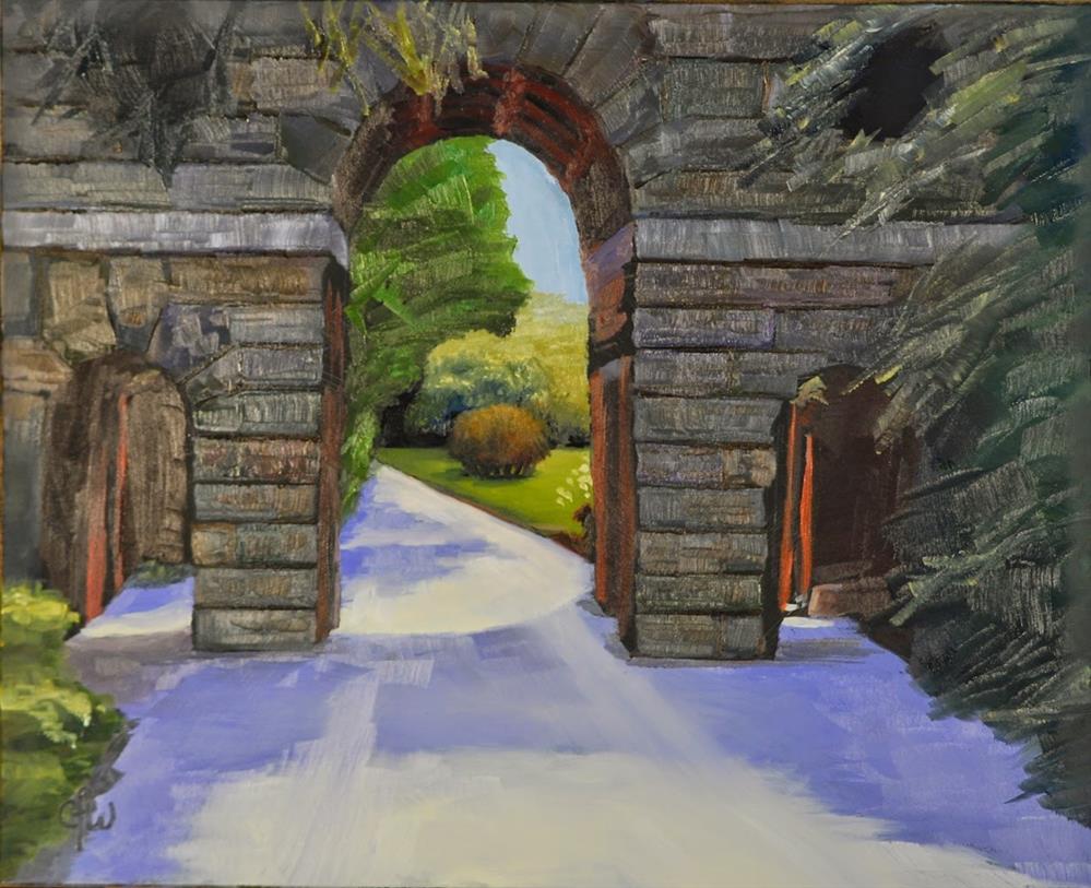 I painted this from a photo that I took a few years ago in KEW gardens in the UK. This is a folly, which just means its a structure with no use other than decoration. Apparently, it was once used as a bridge to bring cattle into enclosed pastures in the garden. It is made of brick and clad with stone.