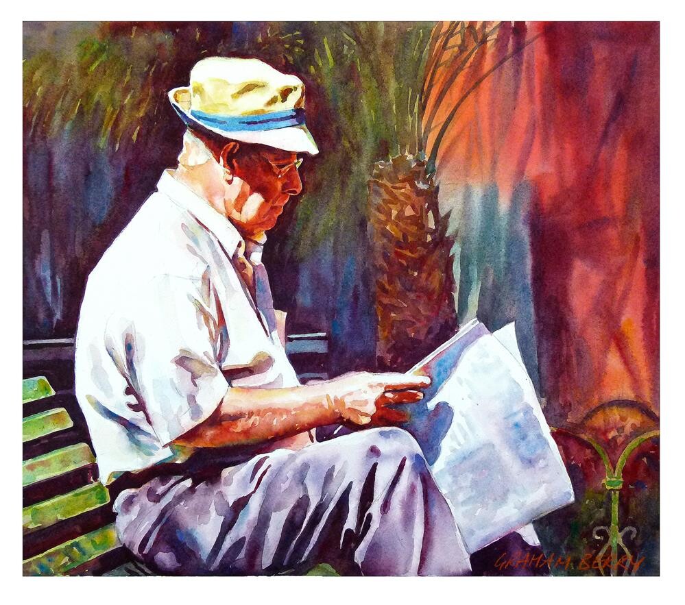 A man enjoying the winter sun in Puerto de la Cruz, Tenerife, reading about how cold it is back home in the UK. |