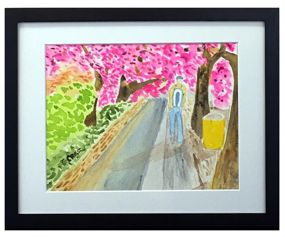 Cherry Blossom Stroll - Painted on a 9 inches tall x 12 inches wide sheet of Windsor and Newton 140 lb, cold pressed, watercolor paper with Daniel Smith Extra Fine watercolors. Painted on March 31, 2021. The frame is a black wood Ambiance gallery frame that is 13.25 inches tall x 15.25 inches wide x 1.5 inches thick. The painting is ready to hang the moment you receive it. I normally get a painting in the mail the next business day after purchase, but always ask for 2 days just in case.