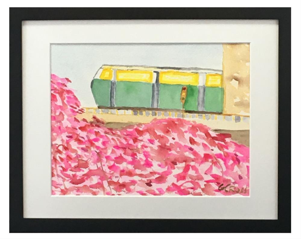 Cherry Wave is a framed and matted watercolor painting of a train surrounded by cherry blossoms. It is one of the Cherry Blossom series of watercolors.