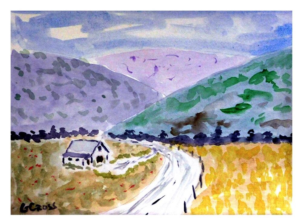 This is an original landscape painting of a country lane through fields past a house and into the distant hills. This was painted with Daniel Smith Extra Fine watercolors on Strathmore Vision 140 lb watercolor paper. This is an original landscape painting of a country lane through fields past a house and into the distant hills. This was painted with Daniel Smith Extra Fine watercolors on Strathmore Vision 140 lb watercolor paper. |