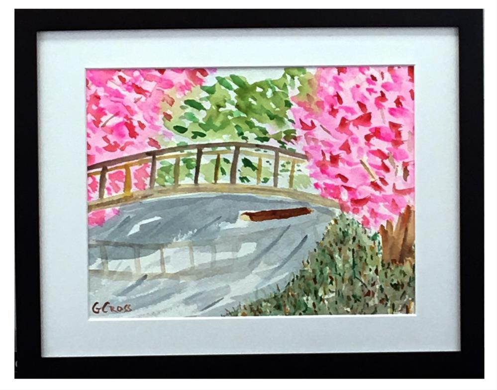 Drifting Among Cherry Blossoms is a framed and matted watercolor landscape Painting of a bridge among cherry blossoms. It is one of the Cherry Blossom series of watercolors.