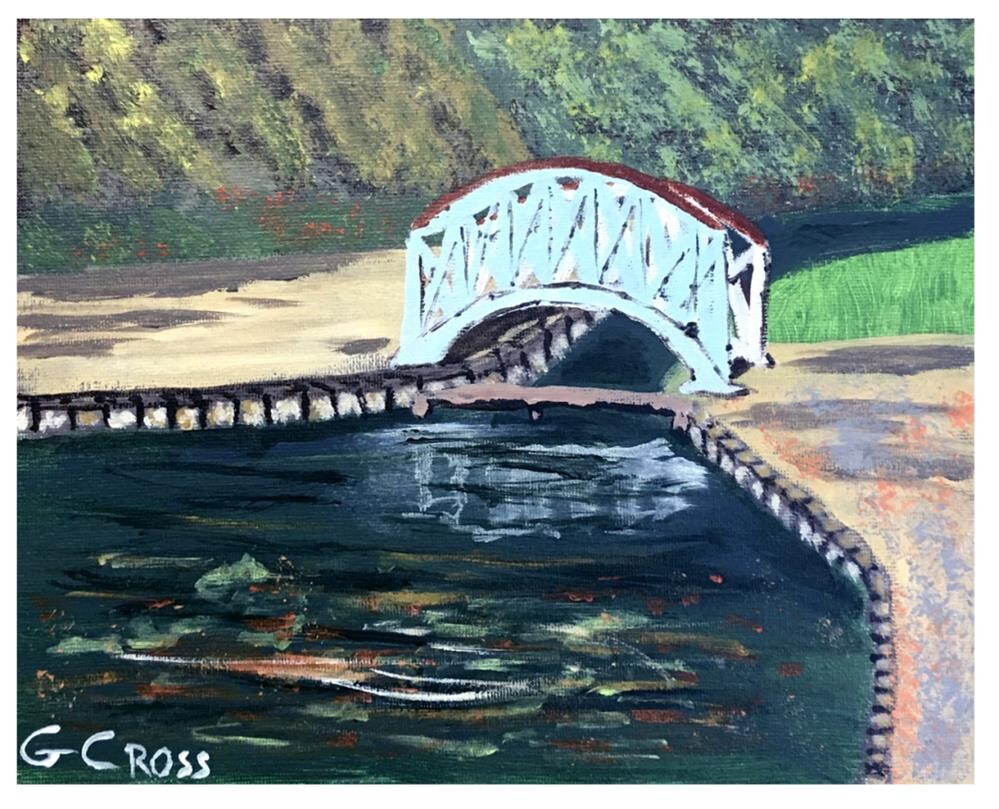 Titled "Footbridge" it was created by me, Gregory Cross, on November 4, 2018 using Golden heavy body acrylic paints on a 8 inches tall x 10 inches wide US Art Supply Liberty series canvas painting panel. I normally ship a painting the next business day after purchase but sometimes it takes two. I use priority shipping with the USPS within the United States.