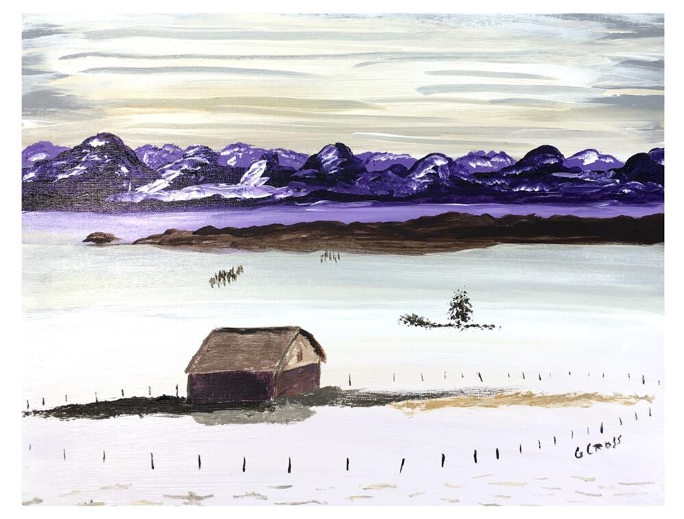 Here is my first "real" painting of 2023. Not practicing. Used all professional materials. It is a painting of a fenced field with a shed with mountains in the distance. I called it "Forlorn Fields"Title: Forlorn FieldsMaterials: Golden heavy body acrylics on an 11 inches tall x 14 inches wide Centurion LX stretched linen canvas. Date Painted: January 6, 2023.Painting is signed.