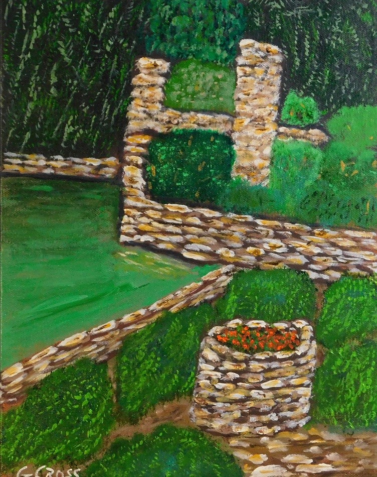 This is an original landscape painting a section of the Japanese Gardens in Brackenridge Park, San Antonio, Texas. Though I did not paint this for the September challenge, it is full of rock walls so it applies.. This was painted with Golden Heavy Body acrylics on a Blick Premier cotton canvas. The painting is signed G Cross on the front and has my full signature, painting number, daily painting project number, and the date it was painted on the back. Please understand colors may vary slightly between the actual painting and the image on your screen due to my digital camera's results and your monitor.