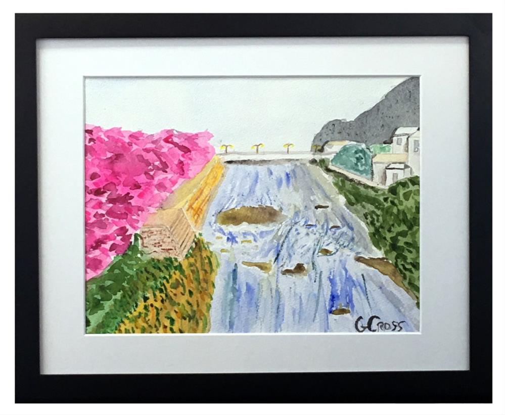 Kyoto Cherry Blossoms Along River is a framed and matted watercolor landscape painting of the Cherry Blossom series of watercolors.