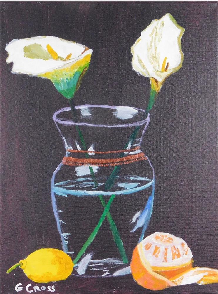 This is an acrylic still life painting of a vase of two lilies with an orange and a lemon. This painting has been in two exhibits. First, it was at Bihl Haus Gallery in December 2018 to February 2019. And then it was exhibited at Elvira Cisneros Senior Center from February 2019 until February 2020. It was painted in August 2018 with professional murial acrylics on a 16 inch x 12 inch canvas. Please understand colors may vary slightly between the actual painting and the image on your screen due to my digital camera's results and your monitor. This is an acrylic still life painting of a vase of two lilies with an orange and a lemon. This painting has been in two exhibits. First, it was at Bihl Haus Gallery in December 2018 to February 2019. And then it was exhibited at Elvira Cisneros Senior Center from February 2019 until February 2020. It was painted in August 2018 with professional murial acrylics on a 16 inch x 12 inch canvas. Please understand colors may vary slightly between the actual painting and the image on your screen due to my digital camera's results and your monitor. |