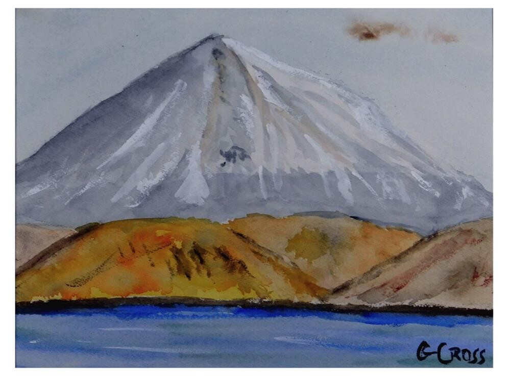 Watercolor landscape painting of Mount Korovin Volcano on Alka Island in the Alaskan Aleutian Islands. Watercolor landscape painting of Mount Korovin Volcano on Alka Island in the Alaskan Aleutian Islands. |