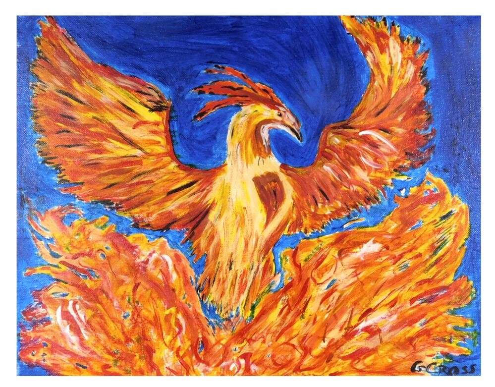 Titled "Pheonix Rising" it was painted by me, Gregory Cross, using Blick Acrylic Mural paints on a 11 inches tall x 14 inches wide Artist Loft stretched cotton canvas. The frame is a black wood gallery style frame by Ambiance. It measures 12.25 inches tall x 15.25 inches wide x 1.5 inches deep.