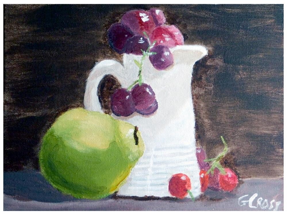 Fruit still life is a classical still life painting and was inspired by a lesson from Richard Robinson's Udemy course "Mastering Still Lives" that I did in early 2019. Titled "Pitcher, Pear, and Grapes" this was created by me, Gregory Cross, on February 13, 2019. Painted with Golden heavy body acrylics on a Fredrix Pro series stretched linen canvas. The painting was varnished using Golden water based satin varnish. The painting is signed G. Cross on the front and has my signature, contact information, title, date painted and painting number on the back. Though I try very hard to get the colors in the photos as close to the actual painting as I can, they may still be slightly different from the physical painting. Digital cameras don't pick up certain colors very well and often change the look of a painting slightly. So, understand that the photos are edited. I am so happy you took the time to view this painting and read the description. Fruit still life is a classical still life painting and was inspired by a lesson from Richard Robinson's Udemy course "Mastering Still Lives" that I did in early 2019. Titled "Pitcher, Pear, and Grapes" this was created by me, Gregory Cross, on February 13, 2019. Painted with Golden heavy body acrylics on a Fredrix Pro series stretched linen canvas. The painting was varnished using Golden water based satin varnish. The painting is signed G. Cross on the front and has my signature, contact information, title, date painted and painting number on the back. Though I try very hard to get the colors in the photos as close to the actual painting as I can, they may still be slightly different from the physical painting. Digital cameras don't pick up certain colors very well and often change the look of a painting slightly. So, understand that the photos are edited. I am so happy you took the time to view this painting and read the description. |
