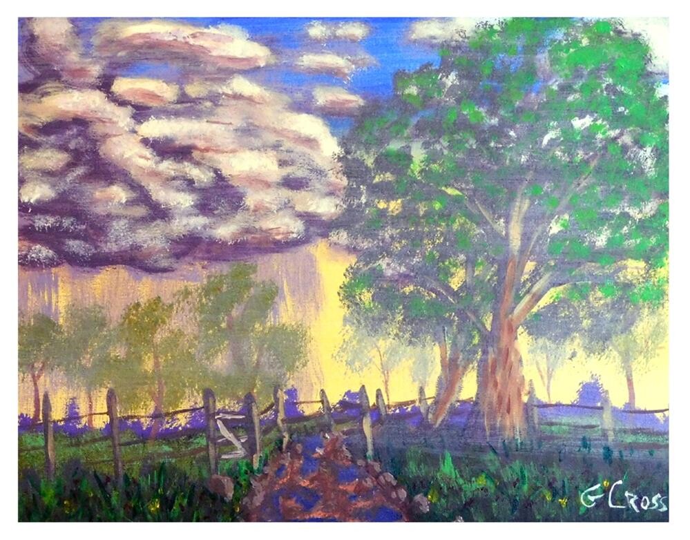 Title: Rainy Morning Artist: Gregory Cross Date Painted: February 11, 2019. Dimensions: 11 inches tall x 14 inches wide Shipping: Free shipping with USPS. Description: This is an original acrylic landscape painting of morning storm over a rural area. Materials: It was painted with Golden heavy body acrylics on a U.S. Art Supply Liberty Series artist quality canvas panel Notes: The painting is signed G Cross on the front; and has my full signature, the painting number, and the date it was painted on the back. Please understand colors may vary between the actual painting and the digital image on your screen due to my digital camera's results and your monitor's settings.