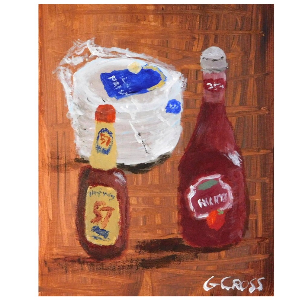 Description: This is an original acrylic still life painting of a bottle of ketchup and steak sauce beside a pack of paper plates.