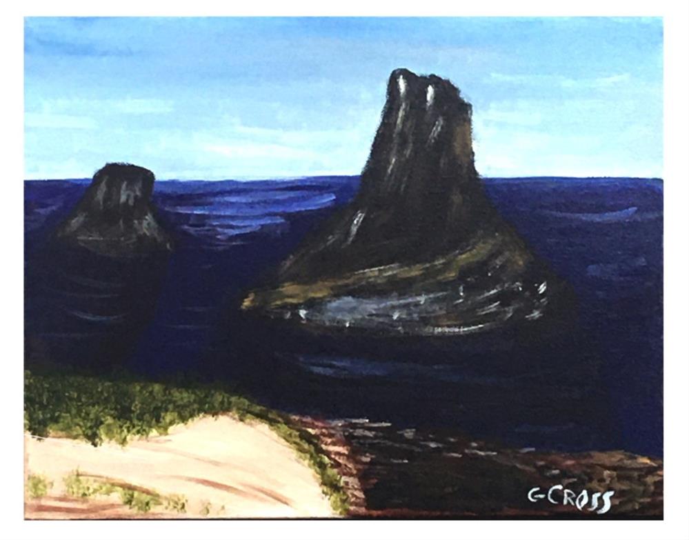 Titled "Sea Stacks" it was created by me, Gregory Cross, on June 8, 2019 using Golden heavy body acrylic paints on a 11 inches tall x 14 inches wide Blick Premiere stretched cotton canvas. It is varnished with Golden waterbased satin varnish.