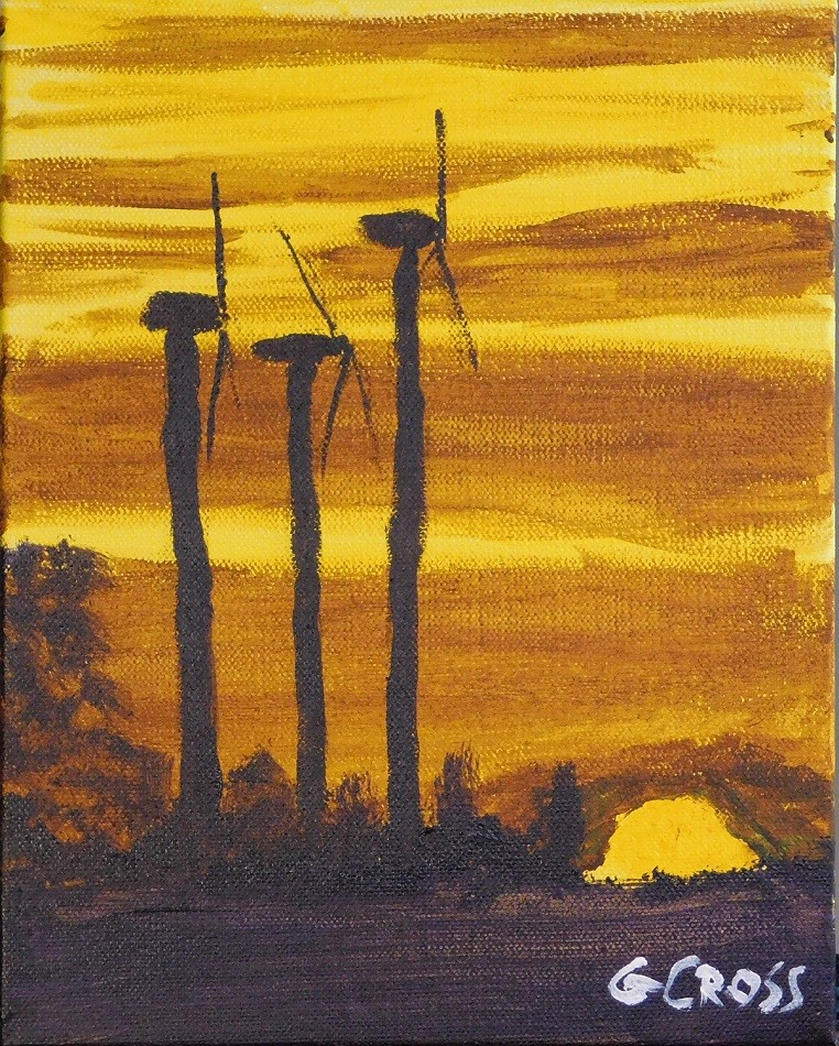 This was painted during a time when I was experimenting with atmospheric effects and I used some wind turbines as the subject againts a yellow sunset. Heat is shimmering and distorting the poles for the turbines. Title: The New Horizon Artist: Gregory Cross Date Painted: September 19, 2019. Description: This is an original acrylic landscape painting of three wind turbines against a yellow sunset. Materials: It was painted with Golden heavy body acrylics on a 10 inch tall x 8 inch wide x1.5 inches deep Blick Premiere gallery wrapped cotton canvas. The sides are painted and it is varnished. It is wired to hang. No frame is needed. Notes: The painting is signed G Cross on the front, and has the artist's full signature, painting number, and the date it was painted on the back. Please understand colors may vary between the actual painting and the digital image on your screen due to my digital camera's results and your monitor's settings. Artist note: My artwork has been liked by Danny Trejo, the movie and voice actor; by the movie actress Holly Horner; by the famous Japanese artist and teacher Harumichi Shibasaki; the famous artist and art teacher Malcolm Dewey; by the Belgian rock band Blackbriar; the Hungarian rock band Metalwings; and by YouTube personalty and artist Liron Yanconsky. Gregory Cross has had paintings on exhibit at the San Antonio Public Library, Bihl Haus Art Gallery, and now in a second annual exhibit at the Elvira Cisneros Senior Center. He also was one of the artists who painted the 60 foot x 6 foot San Antonio Tricentennial Mural. Art critics have discribed his work as surrealistic but with the charm of the everyday; full of visual surprises with anti-gravity, wittiness, and irony. His paintings have sold in many countries. This was painted during a time when I was experimenting with atmospheric effects and I used some wind turbines as the subject againts a yellow sunset. Heat is shimmering and distorting the poles for the turbines. Title: The New Horizon Artist: Gregory Cross Date Painted: September 19, 2019. Description: This is an original acrylic landscape painting of three wind turbines against a yellow sunset. Materials: It was painted with Golden heavy body acrylics on a 10 inch tall x 8 inch wide x1.5 inches deep Blick Premiere gallery wrapped cotton canvas. The sides are painted and it is varnished. It is wired to hang. No frame is needed. Notes: The painting is signed G Cross on the front, and has the artist's full signature, painting number, and the date it was painted on the back. Please understand colors may vary between the actual painting and the digital image on your screen due to my digital camera's results and your monitor's settings. Artist note: My artwork has been liked by Danny Trejo, the movie and voice actor; by the movie actress Holly Horner; by the famous Japanese artist and teacher Harumichi Shibasaki; the famous artist and art teacher Malcolm Dewey; by the Belgian rock band Blackbriar; the Hungarian rock band Metalwings; and by YouTube personalty and artist Liron Yanconsky. Gregory Cross has had paintings on exhibit at the San Antonio Public Library, Bihl Haus Art Gallery, and now in a second annual exhibit at the Elvira Cisneros Senior Center. He also was one of the artists who painted the 60 foot x 6 foot San Antonio Tricentennial Mural. Art critics have discribed his work as surrealistic but with the charm of the everyday; full of visual surprises with anti-gravity, wittiness, and irony. His paintings have sold in many countries. |