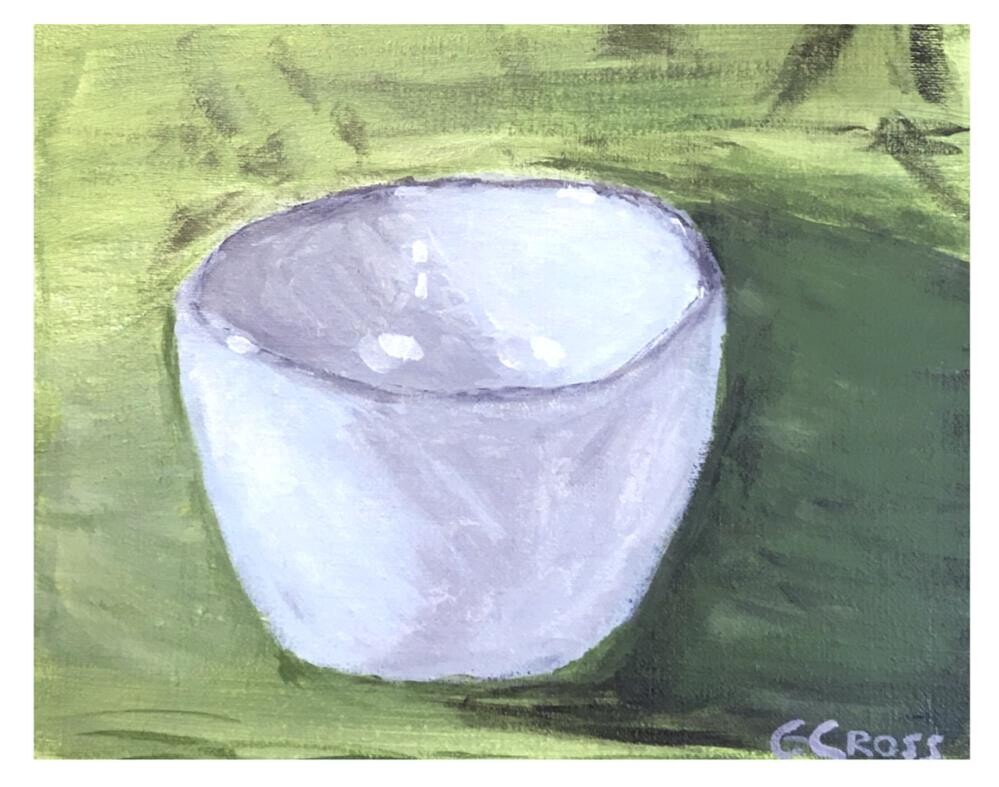 Titled "White Bowl" it was created by me, Gregory Cross, using Golden heavy body acrylic paints on a 8 inches tall x 10 inches wide Fredrix Pro series linen over wood panel on March 22, 2019. I normally ship a painting the next business day but sometimes it takes two. Free shipping, I use USPS Priority Mail within the United States.