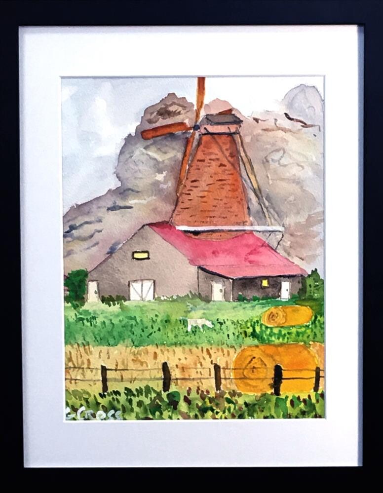 Titled "Windmill Before the Storm" it was painted by me, Gregory Cross, on July 24 2021 using Daniel Smith Extra Fine watercolor paints on a 12 inches tall x 9 inches wide sheet of Windsor and Newton 140 lb, cold pressed, watercolor paper. The frame is a 15.25 inches tall x 12.25 inches wide black wood gallery frame by Ambiance.