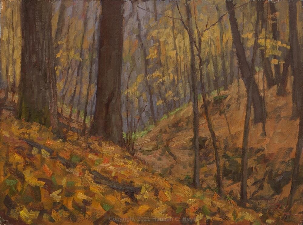 Painted in the woods, a soft rain hitting the leaves that still clung to the branches and that blanketed the steep hillside.