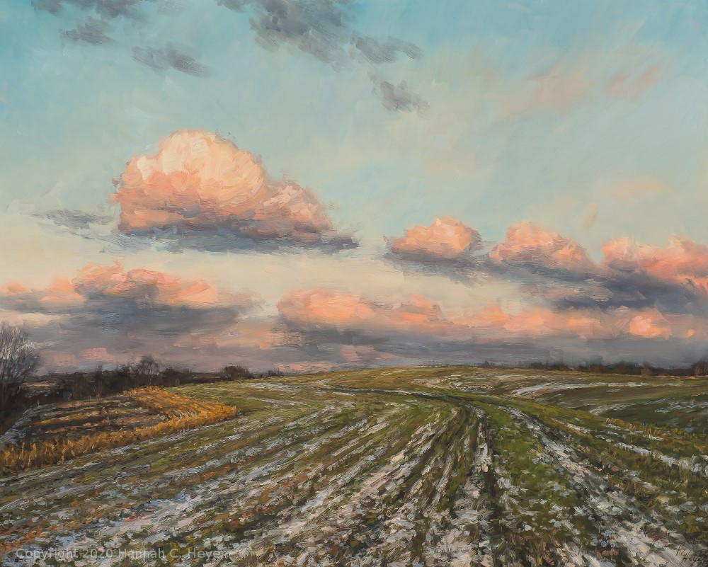 The fields had already begun to green up in the spring, when they were dusted again with a late snowfall; the clouds moving away to the east reflected the light of the low sun of the evening.