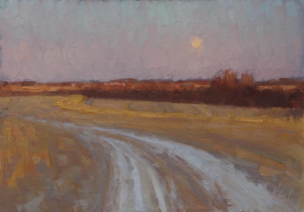 Please note that colors may vary slightly depending on monitor settings, and that no watermark appears on the actual piece. A frosty February morning, with a dusting of snow clinging to the curving field road, and the moon setting quietly in the west.