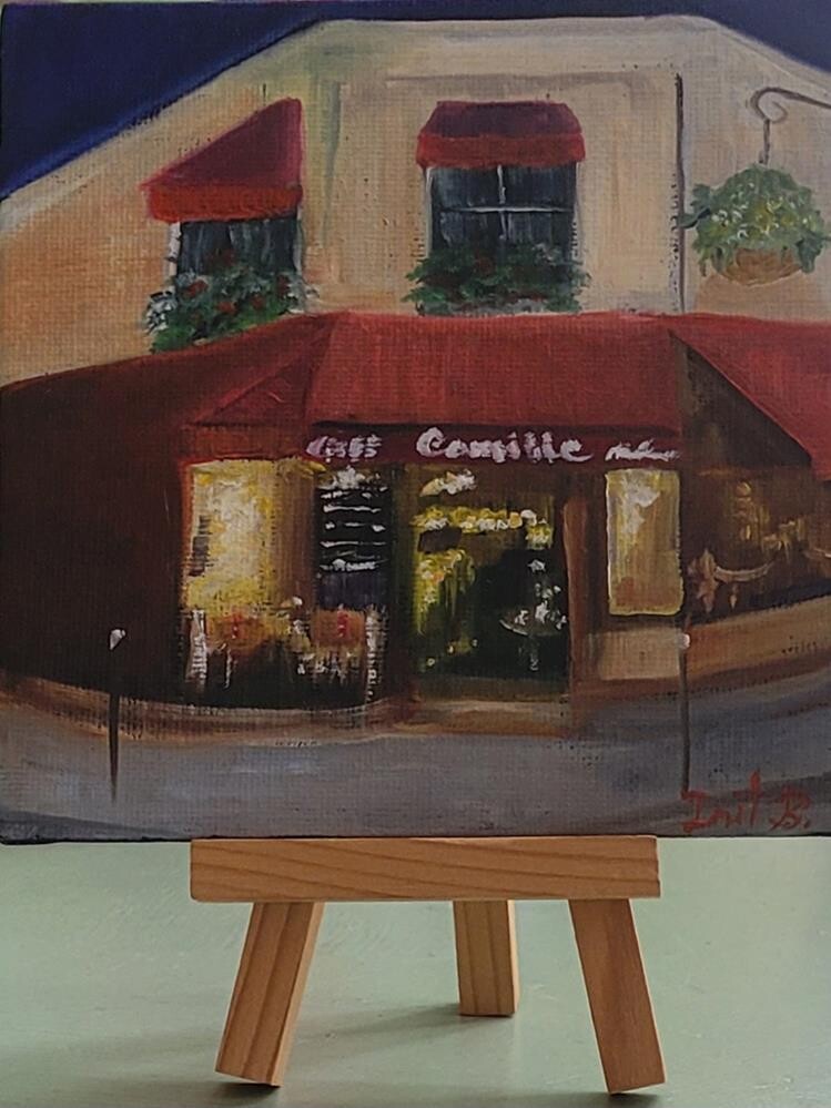 Original oil on 5x5 black gesso canvas panel with display easel. A great everyday Parisian food,Friendly Meals Lunch, Dinner, Brunch, Late Night. The colors may slightly vary due to a digital camera's result and depending on your monitor.