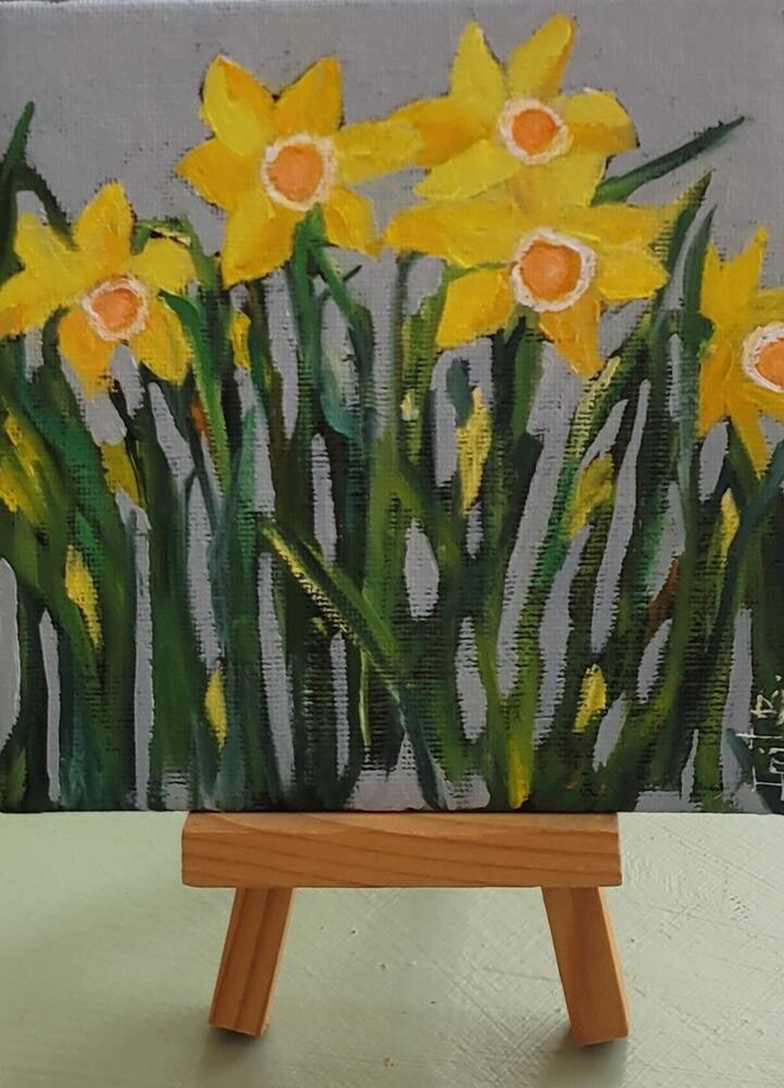 Original oil on 5x5 black canvas panel with small easel. The proceeds from the sale of the painting will contribute to the fight against cancer. Dafffodil Days, ussually held in March, raise funds and awareness for cancer using this cheerfull symbol. Since 1950, the Daffodil has served as a symbol of hope and resilience in the face of cancer. The colors may slightly vary due to a digital camera's result and depending on your monitor.