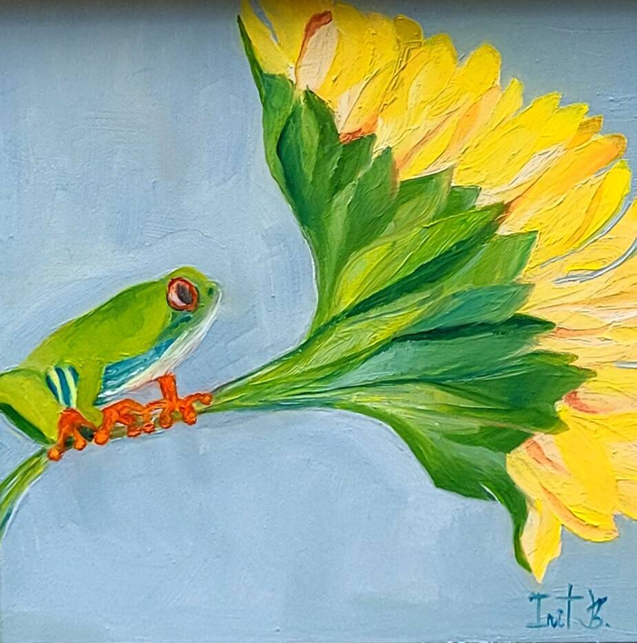 Original oil on 6 x 6 Ampersand museun series gessobord with display easel. Red-Eyed Tree Frogs are arboreal frogs about 3 in long, and up to .5 oz in weight that can be found in the tropical rainforests of Central and South America. Red-Eyed Tree Frogs generally have green skin, red eyes, orange feet, and striped sides with yellow, orange, or blue. The colors may slightly vary due to a digital camera's result and depending on your monitor. Original oil on 6 x 6 Ampersand museun series gessobord with display easel. Red-Eyed Tree Frogs are arboreal frogs about 3 in long, and up to .5 oz in weight that can be found in the tropical rainforests of Central and South America. Red-Eyed Tree Frogs generally have green skin, red eyes, orange feet, and striped sides with yellow, orange, or blue. The colors may slightly vary due to a digital camera's result and depending on your monitor. |