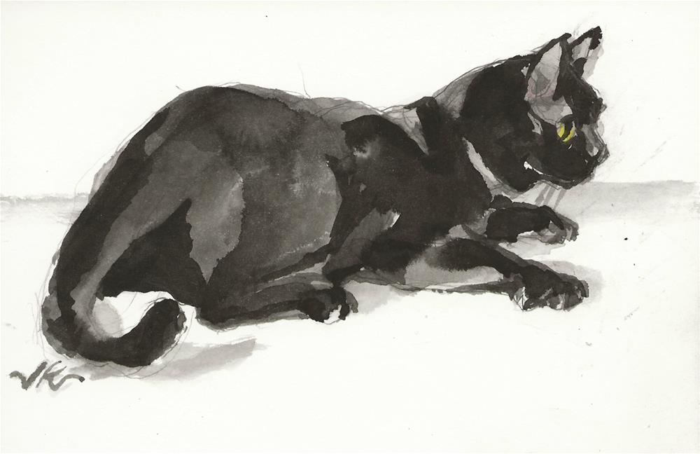 I had a heck of a time sketching this portrait. I couldn't get his head right. I paint these Daily Cats by sketching the outline and light parts of the image with a cheap, click type mechanical pencil. I erase frequently until I get an image that matches a photo I've taken. Getting the proportions right is often the main problem for me in getting an accurate representation. Control of this ink can also be challenging.