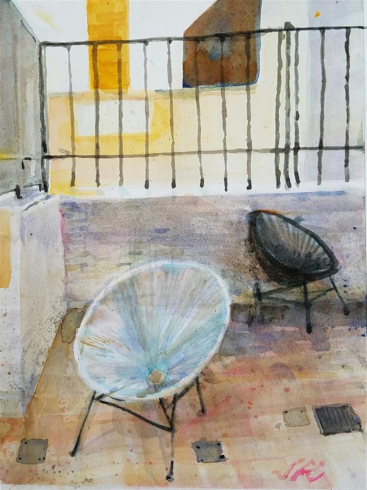Edwardo invited us to dinner last weekend. He has a highrise apartment in downtown Campinas, Brasil. The view's great from the seventeenth floor and his deck is enormous and totally private. I was caught by the combination of geometry and airy openess and painted it in tribute to built spaces.