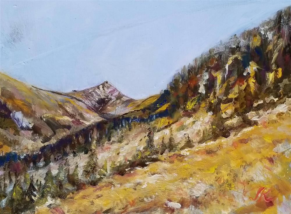 It's late, late summer and I can still hike the eastern foothills of the Rockies. The weather has bee wonderful, warm and all clear cobalt skies. The grasses that thrive at timberline are yellow ochre and white, the evergreens remain their consistent mix of cadmium light, ultramarine with burnt umber. I'm amazed at the colors one can mix from 5 or 6 tubes.