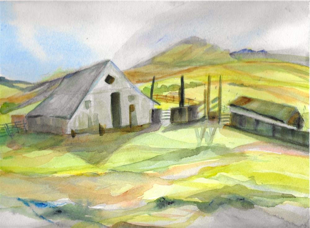 Looking southeast, the barns, the fences, the hills and mountains beyond glow in the mid morning sun. The horses are out to pasture.