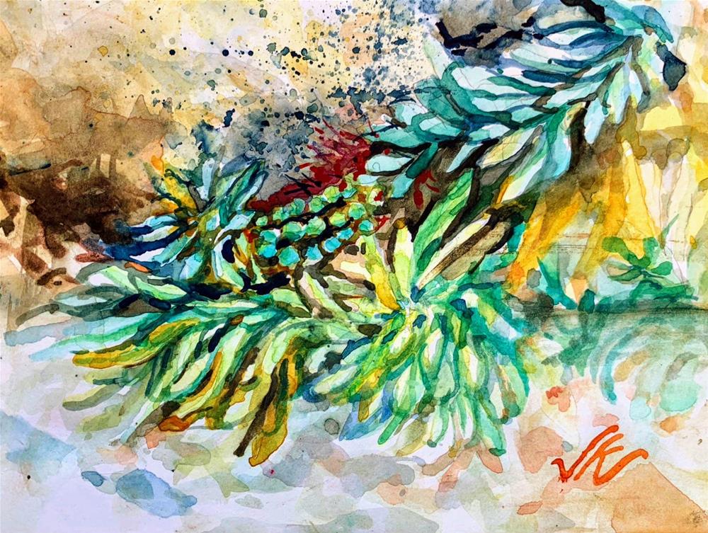 A vignette of a green and red shrub that thrives in Arizona's deserts. It's botanical name is Callistemon viminalis.