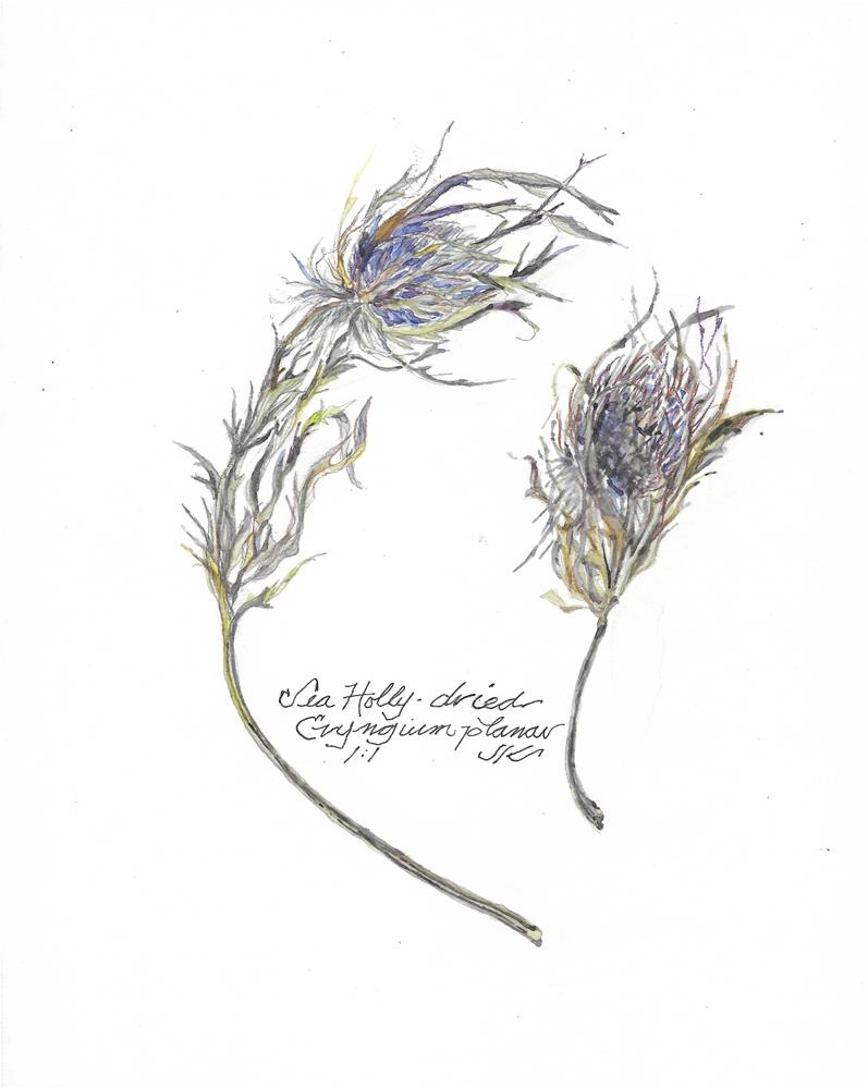 A couple months ago, I got a bunch of Sea Holly from Trader Joe's with the intention of painting the whole thing. Time went by, the flowers dried, wilted and I threw them out, saving this one blossom to paint. Here it is, still thistley blue, green and grey. I planted these in the yard in New York last fall and will find out if they survived the winter when we return this spring.