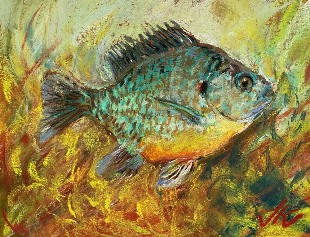 It's summer and the Sun Fish dart about the warm shallows just off shore. There are several varieties.This one is a 'Pumpkin Seed", named so because of the distinctive red/orange 'ear' on its gill.