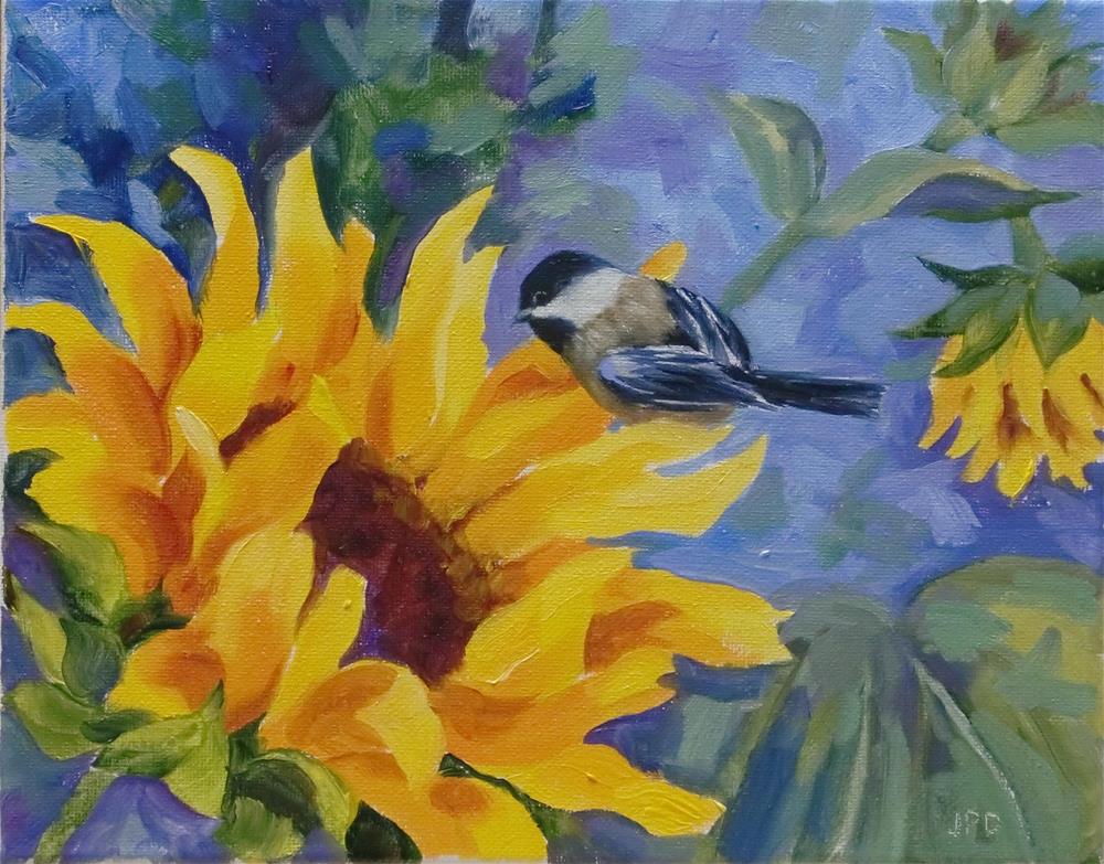 Media: Oil Chickadee on Sunflower checking if the seeds are ready to eat.