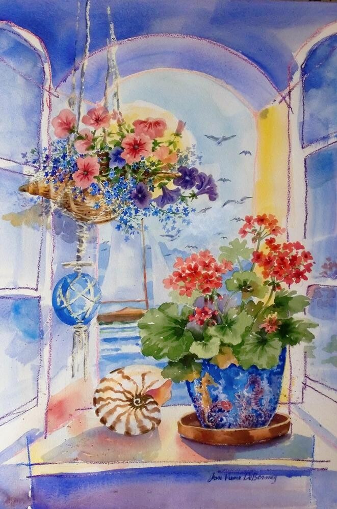 Seaside window with geranium and hanging shell planter. Seaside window with geranium and hanging shell planter. |