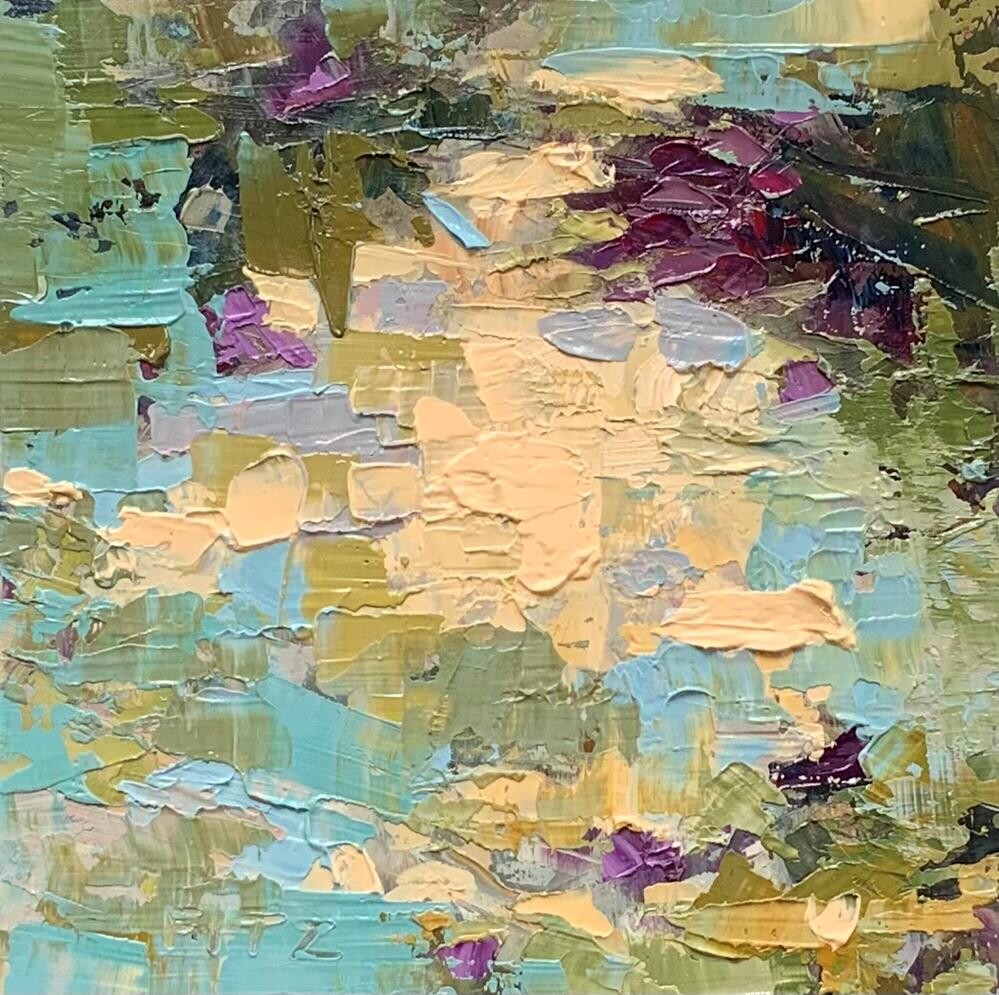 I used a knife to paint this piece. Purple and yellow provide the main contrast and are supported by a range of blues and greens. I used a knife to paint this piece. Purple and yellow provide the main contrast and are supported by a range of blues and greens. |