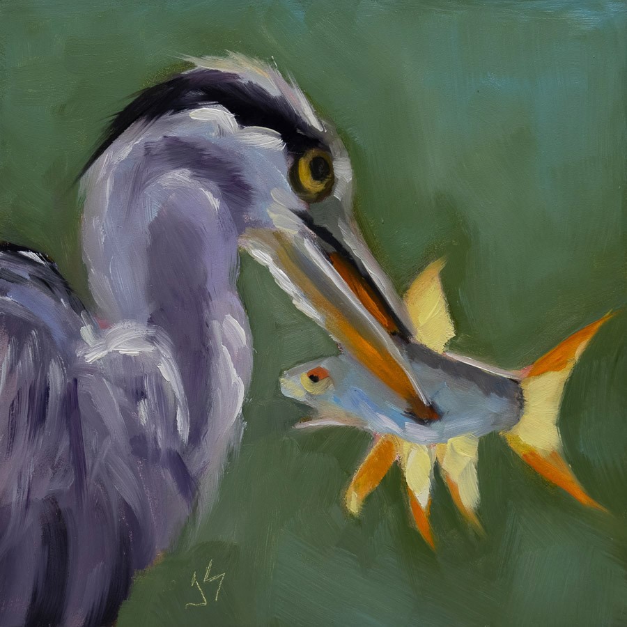 Have been wanting to paint this drama for a while. Love the way the fish is backlit. Image from Pixabay wal_172619 - Grey Heron.