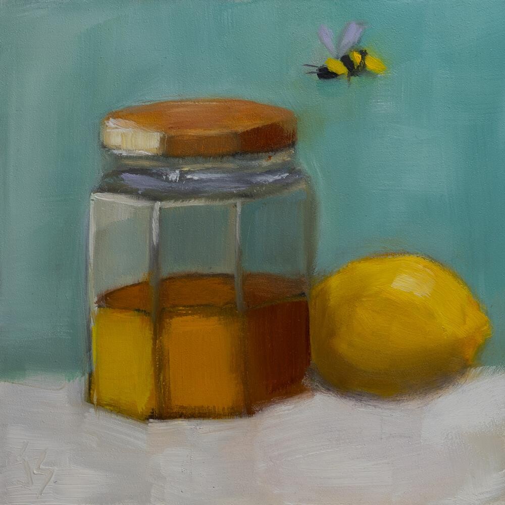 What fun painting a honey jar and lemon to cure whatever ails you. Was a bit boring until that little bee decided to fly into the painting and bring it to life.