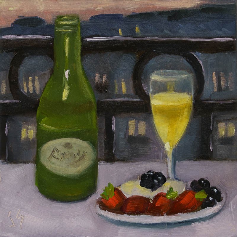 Sunset on the balcony - pink sky and dark shadows at the foot of the Eiffel tower. Someday I may get the nerve to actually paint the tower. Challenging pink sky and luscious hues, but way fun.